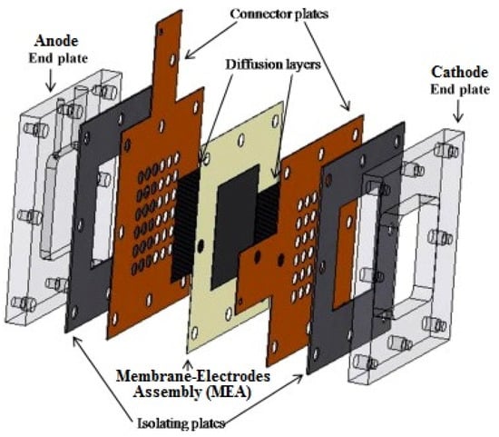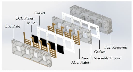 The technology fundamentals of a DAFC device can be roughly divided into its core components: the membrane electrode assembly (MEA) and the general system/cell structuring and packaging (e.g., the current collectors (CCs) and the end plates). Figure 1 presents an exploded-view schematic of the DAFC main components.