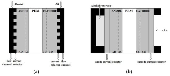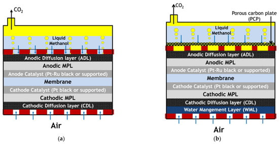 Schematic diagram of passive DMFCs: (a) liquid-fed; (b) vapor-fed. Reproduced from [120] with permission from Elsevier 2018.