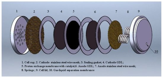 In view of the possible use of PS-DMFCs as a replacement for batteries, we start by presenting a novel button-type PS-DMFC reported by Zhu et al. [92]. This design combines the layout of the traditional block-type DMFC and that of the conventional button-type battery (Figure 3). In this way, the researchers were able to eliminate bolts in the packaging structure, which was considered a major drawback for the miniaturization process, since bolts cover a large area, thus reducing the specific energy (energy per unit weight), as well as power density (power per unit area), of the device. Thus, the novel button-type PS-DMFC allowed improving the effective area ratio of the cell, which was 1.77 cm2.