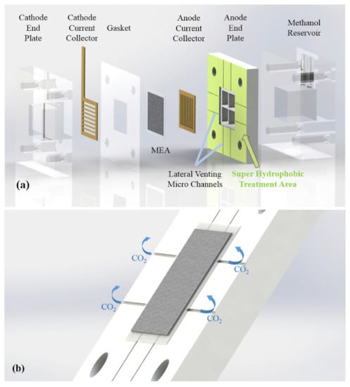 Regarding the CO2 removal issue, a novel structure allowing its release to the surroundings directly from the ADL of PS-DMFCs, through a super-hydrophobic lateral venting design, was proposed by Li et al. [100]. In this design (Figure 4), the interior surface of the anode end plate, with six lateral venting micro channels (0.2 mm depth × 0.2 mm width), was coated with a super-hydrophobic fluoropolymer [101]. Using this novel cell configuration, the researchers also implemented a conventional anode end plate (without lateral venting channels) to be used as a reference. Moreover, for both designs, to evaluate the effect of the lateral venting design on gas removal, the researchers also fabricated models were the inlet/outlet holes and other seams were carefully sealed (totally enclosed). In addition, as the SS anode CC was replaced by a porous carbon plate to avoid MCO during high-concentration operation, they named it “cell-CP”.