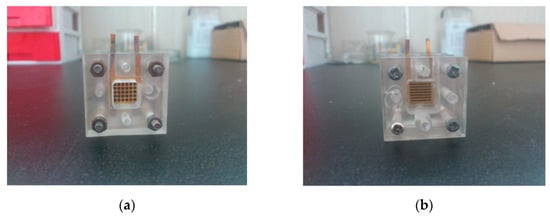 Pictures of the PS-DMFC assembled with trilaminar catalytic layered from (a) the cathode and (b) the anode side. Reproduced from [104].