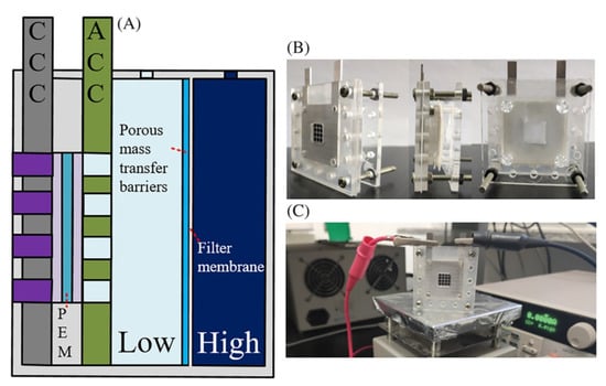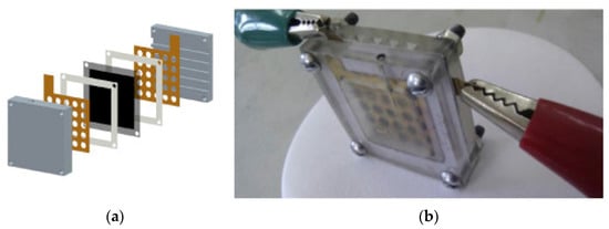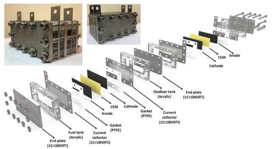 Schematic of the assembled PS-DMFC stack to verify the model based on Debye–Hückel ionic atmosphere theory in exploded view. Reproduced from [144] with permission from Elsevier 2021.