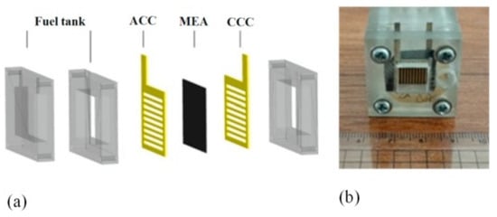Assembled PS-DMFC: (a) schematic of the structure; (b) picture of the device. Reproduced from [110] with permission from Elsevier 2018.