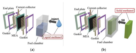 A more radical approach to a new type of PS-DMFC was presented by Lu et al. [125], which they called the “all-solid-state” passive DMFC. It was based on “solid methanol” fuels prepared by combining a methanol solution and an absorbent material. Thus, it was very different from conventional liquid-fed devices, as highlighted in Figure 11.