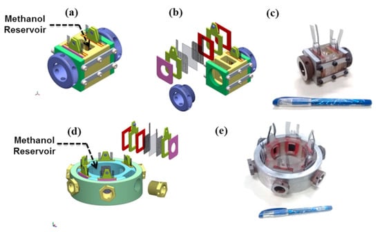 Schematic of novel quick-fit PS-DMFCs stacks: (a) configuration of the two-cell mini-stack; (b) exploded view depicting the various components and (c) picture of the device; (d) configuration of the six-cell mini-stack and (e) picture of the device. Reproduced from [145] with permission from Elsevier 2021.