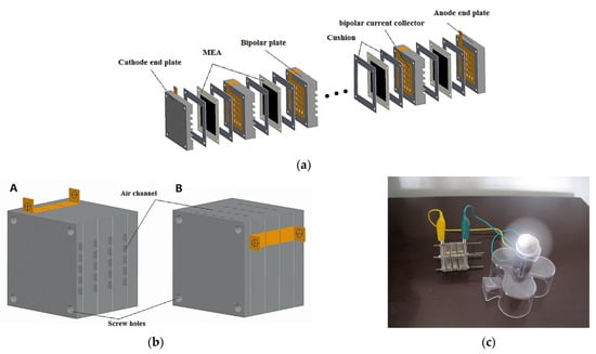 As mentioned above, an important consideration in the DMFC stack structure design is the internal connections, and this aspect was highlighted in the paper by Wang et al. [147]. The main objective of their study was to develop a high-performance low-cost bipolar passive DMFC stack for portable applications, using a novel CC design, which seamlessly integrated internal and external electrical connections, thereby reducing the resistance losses. In this way, the researchers assembled in series a typical four-cell passive DMFC stack, where each MEA had an active area of 2.0 × 2.5 cm2 (Figure 14). The maximum PD of the passive stack, when tested under different methanol concentrations, was 18.7 mW·cm−2 at 3 M. Moreover, the researchers also studied the effect of two orientation modes for the BPs on the performance of the PS-DMFC stack, which they called modes A and B, corresponding to the cathode air channels placed parallelly and vertically, respectively. The results indicated that the PS-DMFC stack in mode B exhibited a better and more stable performance than its counterpart in mode A when discharging high currents, with almost no difference when discharging low currents. These findings were explained by the fact that, in mode B, the water produced and accumulated in the air channels at the cathode under high discharging currents can be easily transferred to the outside through the air channel by gravity. Additionally, during long-term testing, they observed that the PS-DMFC stack in mode B had a better performance and, thus, better MOR and ORR kinetics. Lastly, a “good” performance of the bipolar passive DMFC stack was confirmed by powering a micro fan (rated power 150 mW) every 20 days for 100 days. This test also revealed that the stack performance deterioration aggravated with time; on the 100th day, the performance was only 83.33% of the initial value. This was explained by the attenuation of the catalytic performance in the MEAs, caused by MCO and catalyst contamination by pollutant compounds present in the environment, such as sulfides.