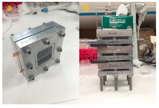 Another strategy for the design and fabrication of a quick-fit architecture PS-DMFC, which was extended to two- and six-cell stack working prototypes, was reported by Abraham and Chetty [145]. The authors presented a novel clamping mechanism (a single SS tightening cylinder) as an alternative to the conventional screw-bolt-based clamping design for planar PS-DMFCs with an active area of 3 × 2 cm2. This new clamping mechanism was able to hold the cell components together firmly, avoiding fuel leakage and limiting cell resistance, in addition to being easily extendable for stack operation, providing the possibility of individual cell diagnostics, and allowing the replacement of a faulty individual cell. Moreover, the researchers also used these new configurations to evaluate the performance of Pt and PtRu catalysts prepared by pulse electrodeposition on Ti mesh-based electrodes, which were employed and compared to the traditional carbon-based electrodes on the basis of their previous studies [146] and the well-known beneficial physicochemical properties of Ti mesh. In this study, the Ti mesh was used in order to decrease the MEA overall thickness, by acting as a catalyst support and a CC. The researchers showed that it was even able to replace the GDL at the anode. For the cathode side, the absence of a GDL drastically reduced the cell performance, which was attributed to limited diffusion of O2. Thus, the best performance was achieved with a 2 M methanol solution, PtRu on an 80 mesh (47% open ratio) Ti anode, and Pt/C-coated GDL with 40 mesh (71% open ratio) Ti cathode, reaching an OCV of 0.496 V and a maximum PD of 2.7 mW·cm−2. This optimized single cell was extended to two-cell and six-cell mini-stacks, by connecting the cells in series using copper wires with alligator clips on each end (Figure 13).
