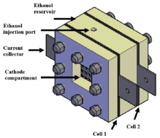 In spite of all the advances and improvements reported for PS-DMFCs, with an acidic or alkaline electrolyte, it should be recalled that a single-cell voltage output is limited to less than 0.5 V; thus, for small portable applications, with higher voltage requirements (usually higher than 2.0 V), this value cannot be achieved using a single cell. Thus, a DMFC stack, which is sometimes referred to as a cell network, can be a solution to this problem. Moreover, simulation tools can help by providing crucial information regarding the different devices, as previously shown for single cells. An example for mini portable applications, such as cell phones, tablets, and battery chargers, targeting a current and voltage of 1400 mA and 3.7 V, respectively, for a cell network power of 5.18 W, was reported by Ismail et al. [143]. Their approach was based on the development of an optimization model describing DMFC stacks, via a cell integrated network. Thus, a superstructure model was presented, which accomplished the design parameters for a target voltage and current of 3.7 V and 1400 mA, respectively. This was achieved through the optimization of 16 cells arranged in series using Matlab. In summary, an active area of 128 cm2 was necessary, which resulted in an individual active area of 8 cm2. Moreover, the model also predicted the fuel requirements and the total CO2 emission flow rate via the cells. The volume for the cell network was estimated to be 334.60 cm3 with a price of 1400 USD, according to the economic analysis provided in the study. Therefore, this work presented a detailed optimization model and economic analysis for the design of DMFC stacks. In order to optimize the output characteristics and the energy conversion of the PS-DMFC stack and to take a step further in the analysis, Fang et al. [144] presented a new modeling approach, based on the Debye–Hückel ionic atmosphere theory, to describe the charge conduction and electrochemical kinetics during the polarization coupling process of each cell unit within the stack. The proposed model was solved numerically by LabVIEW of National Instruments, using a model structure of a PS-DMFC stack made of four-cell units interconnected in series. The simulated current–power profiles obtained from the model were experimentally validated by assembling an “in-house” PS-DMFC stack made of four-cell units (with an unitary active area of 1.2 × 1.2 cm2) connected according to the geometry and physical parameters of the presented model (Figure 12).