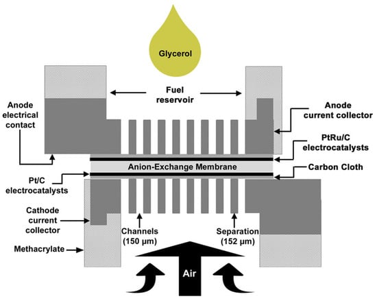 - Olivares-Ramírez, J.M.; Dector, A.; Bañuelos-Días, J.A.; Amaya-Cruz, D.M.; Ortiz-Verdín, A.; Jiménez-Sandoval, O.; Sabaté, N.; Esquivel, J.P. Evaluation of a Passive Anion-Exchange Membrane Micro Fuel Cell Using Glycerol from Several Sources. Fuel Cells 2019, 19, 10–18. [Google Scholar] [CrossRef] [Green Version]