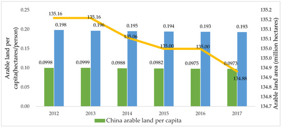 On the other hand, the development of urbanization accelerates the reduction in agricultural land in China. In recent years, with the occupation of non-agricultural construction, disaster destruction and agricultural restructuring, the area of cultivated land in China has declined sharply. The total area of cultivated land decreased from 135.16 million hectares in 2000 to 134.88 million hectares in 2017. A study conducted by the Chinese government and the United Nations Development Program shows that population carrying capacity of land in China is 1.7 billion people, based on the warning line of 0.053 hm2 per capita cultivated land determined by FAO (Food and Agriculture Organization of the United Nations). The premise, however, is that no less than 120 million hm2 of cultivated land must be retained. Therefore, Outline of China’s Land Planning (2016–2030) requires that cultivated land in China should be kept above 124.3 million hm2 and above 121.6 million hm2 by 2020 and 2030, respectively. Undoubtedly, China’s agriculture is confronted with serious land constraints [9,10].