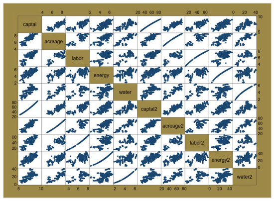 There usually exists a correlation between economic variables, especially when the labor and capital are simultaneously included in the model. Severe multicollinearity will lead to an inaccurate OLS estimator and an invalid test resulting in a single parameter, in which case the wrong statistical inference consequently occurs. Firstly, a correlation matrix of some variables of the model is worked out and described in Figure 2. The points in the graph are traces of a simple scatter plot between different variables, and the stronger the correlation between variables, the more linear the scatter plot tends to be. Apparently, pairwise correlation between most variables can be observed. Intuitively, it is reasonable to believe that there is a multi-collinearity problem of the explanatory variables in the model. Further, a VIF test of the regression model is conducted in order to present more rigorous judgment and the results are shown in Table 3. It can be noticed that the VIF values of all variables are greater than 10, and the mean value is 3558.15. Therefore, it is undoubted that the model has serious multi-collinearity problems.