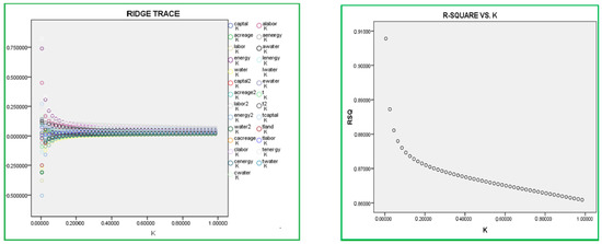 When there is severe multi-collinearity in the model, adopting the ridge regression method instead of the OLS method to estimate Equation (2) can lead to more accurate parameters and make for more reasonable statistical inferences. Generally, the ridge trace is used to determine the value of parameter k in Section 2. The SPSS software is applied here to draw a preliminary ridge trace that is depicted in Figure 3. It can be discerned that, when k = 0.5, all the estimated coefficients together with the slope of residual sum of squares tend to be stable. Therefore, it is appropriate to determine the parameter of k as 0.5. Based on k = 0.5, the ridge regression method is applied to estimate the coefficients in the translog production function based on a fixed effect model, whose results are listed in Table 4. It can be easily observed that the values of the Wald Test statistic and F-Test statistic are 3912.9695 and 144.9248, respectively. Correspondingly, the p values are 0.0000 and 0.0000, respectively, with the Root MSE (Sigma) being 0.0912. Thus, the explanatory ability of the model on the whole is fair and convictive.