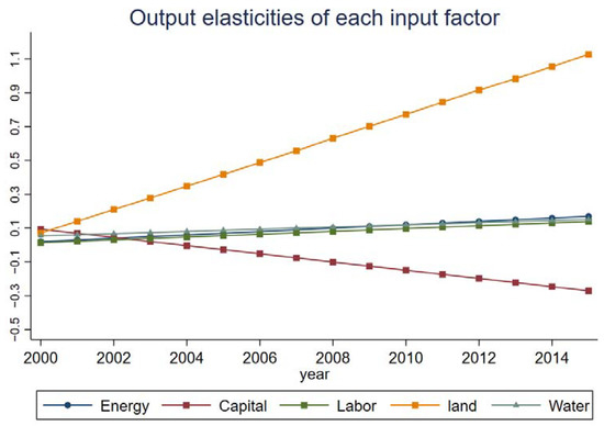 The output elasticity of agricultural input measures the percentage change in agricultural output when the input rises by 1%. This indicator can be used to judge the stage of scale returns of production factors. The estimation of coefficients in Equation (2), together with the computing Equations (3)–(6), can be applied to calculate the output elasticities of China’s agricultural input factors, and the results are shown in Table 5 (the whole country) and Figure 4. From Table 5, we can conclude that the output elasticities of energy, labor, land and water show an increasing trend, especially for energy and land, which rise from 0.0203 to 0.1694 and from 0.0710 to 1.1273, respectively. In addition, the output elasticity of capital decreased from 0.933 in 2000 to 0.0206 in 2003 and remained negative in the following years. The output elasticity of capital is basically negative, which indicates that the phenomenon of capital deepening in China’s agricultural production has appeared and capital has shown a characteristic of decreasing marginal return. In recent years, with the vigorous support of China’s policies for agriculture, investment in agricultural production has increased year by year, showing a capital-driven characteristic. However, with the annual investment of capital, its marginal output has shown a negative result. With regards to energy, the output elasticities show a significantly increasing trend. As the continuous development of agricultural mechanization in China has promoted the improvement of agricultural production efficiency, unit energy input can create more agricultural products. As for agricultural labor, the output elasticity rose from 0.0141 to 0.1388, in line with the realistic transformation of China’s agricultural labor force. Although China has long been known for its large population and abundant labor force, with the rapid popularization of China’s urbanization and the transformation of the concept of youth labor groups, more and more young and middle-aged groups have chosen to take up occupations in secondary and tertiary industries. Additionally, along with the spread of agricultural machinery and modernized agricultural technology, the growth in the number of agricultural laborers contributes further to agricultural production. With regards to land and water, outputs of these two factors are all positive and increase year by year. These results indicate that land and water factors are in the stage of increasing marginal returns, and increasing the factors can make the total agricultural output increase. This is in line with the reality of China’s agricultural land and water resources. On one hand, rapid urbanization in China has resulted in a decline in agricultural land in recent years, from 2.027 billion acres in 2000 to 2.023 billion acres in 2017. Since land in China is under collective ownership, meaning that farmers do not have absolute autonomy in the process of land transfer, the market transaction price does not reflect its value as a scarce resource, and the cultivated land has been shrinking year by year because of state administration. On the other hand, China’s water resources are used extensively, and the effective utilization coefficient of farmland irrigation water is far lower from the world’s 0.7–0.8 level. In addition, water resource pollution is becoming more and more serious. From 2005 to 2015, the area of waterlogging removal and the area of soil and water erosion has continued to increase. All these effects have combined, leading to a growing shortage of agricultural water.