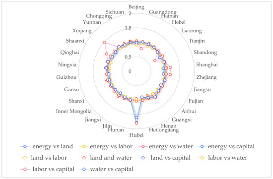 Figure 5 gives the national average of the substitution rates among the factors. It can be seen that the substitution between labor and energy is weaker in the central region and stronger in the northwest and southeast coastal regions, suggesting that increasing agricultural labor in these regions can reduce energy consumption. The substitution between labor and water resources is relatively smaller in the western region and stronger in the central and southeastern coastal regions, suggesting that increasing agricultural labor in these regions is more effective in conserving water resources. The substitution effect between labor and land is smaller in the eastern region and relatively stronger in most provinces in the northwest, suggesting that increasing labor input in the northwest can save land resources. Regarding the substitution between land and water, land and energy, and land and labor, unlike the substitution of capital for water, land, labor and energy, the substitution of land for water, energy and labor does not show obvious regional characteristics, and the elasticity values of most provinces are greater than 1, showing strong substitution characteristics, indicating that land has a strong substitution ability for these three factors. This indicates that land can effectively substitute for these three factors within the sample interval. Therefore, under the situation of land and water scarcity, increasing energy and labor inputs can effectively save land resources.