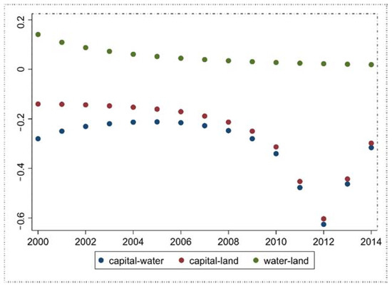 According to [43], the difference in technological progress among production factors can be expressed as , where in the formula represents the cross-term between input factors and the time trend, and it is also the partial derivative of the output elasticity of corresponding factors to the time trend, reflecting the effects of technological progress alone on the output elasticity of factors. In the formula, if > 0, the technology of input factor advances faster than that of factor , and vice versa. Combined with the translog production function, this paper mainly analyzes the differences in the technological progress of capital, water resources and land. From the empirical results in Figure 6, it can be perceived that in the process of agricultural development, the order of technological progress speed is water resources > capital > land. According to the theory of induced technological transition, changes in agricultural technology respond to the relative scarcity of production factors. Combining the research conclusions in this chapter, it can be concluded that water resources are the scarcest element in agricultural activities because their technological progress is the fastest. As for capital and land, their speeds of differing technological progress are not much and show a trend of convergence.