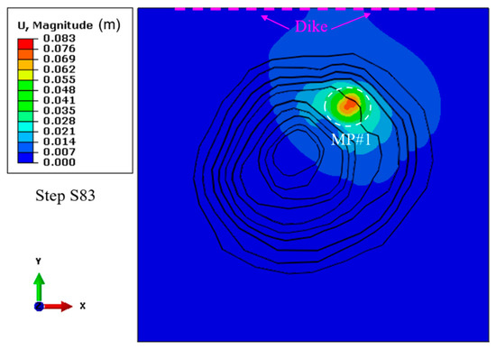 The profile of the computed displacement of the open pit slopes in the FE model is shown in Figure 3. The main areas with maximum ground settlement are over the mining pipe MP#1, where the mining activities are in active production. Though the three mining blocks were backfilled with cemented rockfill (CRF), the open pit boundary in the developed model, where the dike is located, still sees a tiny increase in displacement after the completion of the excavation and backfilling of the three mining blocks. The stability and safety of the protective dike play a significant role in mine site safety.