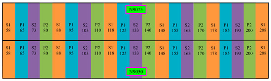 All three sill pillar recovery schemes follow the primary and secondary mining sequence to keep the sequence constant with the three mining blocks’ mining schedules. The primary sequence stopes will be excavated firstly, and then the secondary sequence stopes will be excavated. Figure 4 shows an example configuration of the mining stopes of two mining levels. The colors orange, blue, purple, and green represent the mining sequence. Blue and green represent the primary mining sequence, and orange with purple for the second mining sequence. Here, P stands for the primary sequence, P1 means those stopes will be mined first in the primary sequence, and P2 stands for the second round of mined stopes in the primary sequence. Then, S stands for the secondary sequence, S1 means the first round of mined stopes in the secondary sequence, and S2 means the second round of mined stopes in the secondary sequence. When the stoping starts, stope P1-65 will first be mined out, followed by P1-95. After the first round in the primary sequence finishes, the second round of the primary sequence starts, and then the first round in the secondary sequence starts, followed by the second round in the secondary sequence. The stope of S2-193 will be the last mined-out stope in this level. Each stope will be backfilled as soon as it is mined.
