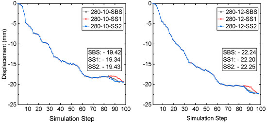 From simulation step S84, the recovery process starts. Scheme SBS takes 11 simulation steps to recover and backfill the two sill pillars, and the simulation step ends at step S94. Both schemes SS1 and SS2 take 15 steps to recover and backfill the two sill pillars, and the simulation step ends at step S98. Though it takes different simulation steps to recover and backfill the two sill pillars, the mining-induced displacements at the monitored zones during the recovery process are almost the same. Figure 6 presents the computed displacement from the FE model at prisms 280-10 and 280-12. The final three displacements at prism 280-10 are −19.42 mm, −19.34 mm, and −19.43 mm, from recovery schemes SBS, SS1, and SS2, respectively. For the prism 280-12, the final three displacements are −22.24 mm, −22.20 mm, and −22.25 mm, respectively, from recovery schemes SBS, SS1, and SS2.