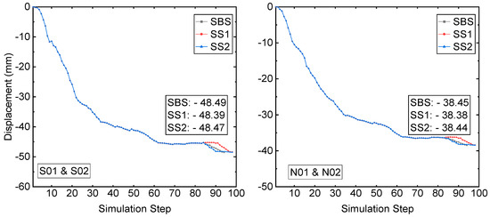 The displacements at monitoring zone 1 and zone 2 are shown in Figure 7. Like the displacement at monitoring zone 3, the final displacements of three different recovery schemes are very close at both monitoring zone 1 and zone 2. At the prism CRF-S, the three displacements are −48.49 mm, −48.39 mm, and −48.47 mm, respectively, from recovery schemes SBS, SS1, and SS2. The three displacements at the monitoring prism CRF-N are −38.45 mm, −38.38 mm, and −38.44 mm, from recovery schemes SBS, SS1, and SS2, respectively.