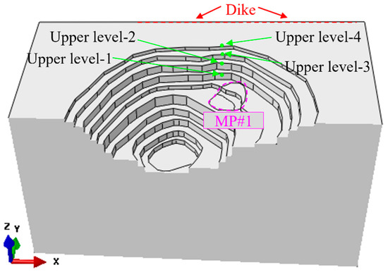 The four selected upper levels are marked with upper level-1 (UL-1), upper level-2 (UL-2), upper level-3 (UL-3), and upper level-4 (UL-4), as shown in Figure 8. Here, upper level-4 (UL-4) is the ground surface at the mine. The elevation between the top surface of mining pipe MP#1 and the ground surface is 94 m. Therefore, the depths of the four bench levels are 0 m, −14 m, −34 m, and −64 m, from upper level-4 (UL-4) to upper level-1 (UL-1), from the ground surface to the top surface of the bench level-1 (UL-1).