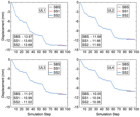 The sill pillar recovery process commences from simulation step S84 and ends at steps S94, S98, and S98 by scheme SBS, SS1, and SS2, respectively. Table 4 presents the average displacements at the upper bench levels of the analyzed locations induced by the sill pillar recovery and backfilling process.