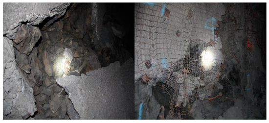According to the studies done by Sepehri [30], Leveille [49,50], and Pu [51], kimberlite and granite in the hard rock mine have the potential for rockburst, which could cause severe damage to the roofs and sidewall surfaces in the stopes and crosscuts. In addition, some reported rockburst failure cases located near the stope accesses in this hard rock mine, as shown in Figure 10. Hence, the stability of the stope access is a key issue to be assessed.