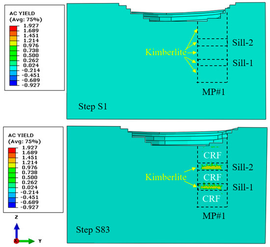 In this hard rock mine, the reserved sill pillar consists of several mining stopes, and each stope can contain thousands of tons of minerals. Compared with the backfilled CRF in the mined voids, the unmined stopes in the sill pillar will provide more support than the backfilled CRF [39]. After completing the excavation and backfilling of the three mining blocks, the stress field changed and was redistributed. Due to the vast volume of the backfilled CRF, there are some yield zones in the unmined sill pillars. Figure 11 presents the yield zone in the two sill pillars at steps S1 and S83. In Figure 11, in the mining pipe MP#1, the yellow areas are the two sill pillars, and the other zones are backfilled CRF.