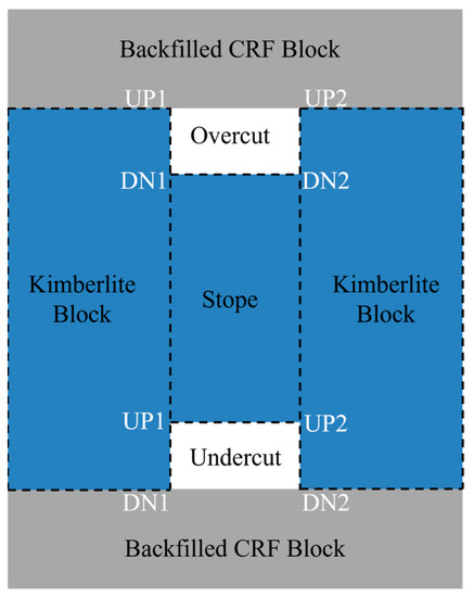 The hard rock mine in this study initially operated as an open pit mine. Once the open-pit mining was completed, the mining operation shifted to the underground. Due to the geological structure and deposition of the minerals, the blasthole stoping (BHS) mining method was used to excavate the steeply dipped mining pipe. According to the mining plan, there are three planned mining blocks in mining pipe MP#1, namely Block-A, Block-B, and Block-C, as shown in Figure 1. There are two initially kept sill pillars between the mining blocks—Sill-1 and Sill-2. The two sill pillars work as the protective pillars, which can effectively prevent the transfer of redistributed stress from one block to another [30]. After the completion of the excavation of three mining blocks, the feasibility of recovery of these two sills then plays a significant role in the resource development plan and prolonging the mine’s life.