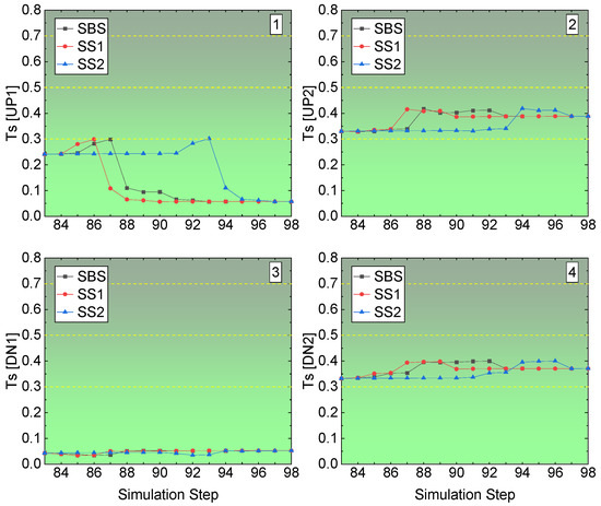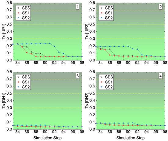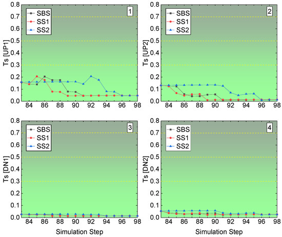 All three sill pillar recovery schemes start at simulation step S84; the following figures start from simulation step S83, which is the last step of excavation and backfilling of the three mining blocks, and simulation step S84 is the first step to recover the sill pillars by three recovery schemes. The Ts values are compared among three sill pillar recovery schemes at the four corners in the stope access section at three stope locations.