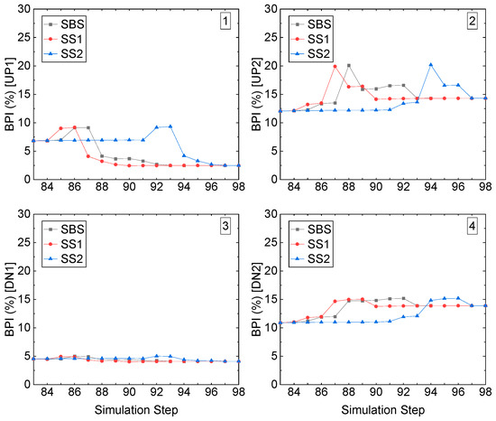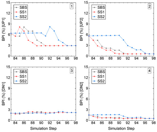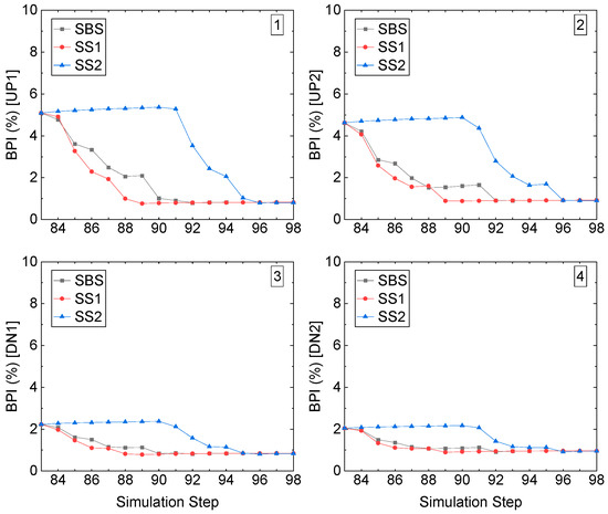 For the middle stope access to undercut in Sill-1, compared with the right-edge one, the BPIs are much smaller, as shown in Figure 18. For the two roof corners, UP1 and UP2, which have the highest BPI compared to the floor corners, the BPIs are not larger than 5%, and the excavation simulation step causes a decrease at both roof corners, as shown in the first and second pictures. On the two-floor corners, DN1 and DN2, as shown in the third and fourth pictures, the BPIs are even much smaller; both are less than 2%, though with the process of excavation, among the three recovery schemes, for recovery schemes SS2, before the excavation occurs, the BPI keeps stable as 2%.