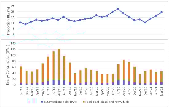 Electricity consumption for Rhodes recorded by the Hellenic Electricity Distribution Network Operator (HEDNO) between January 2019 and March 2021. Blue represents the proportion of the electricity demand supplied via renewable energy sources (RES) (wind and solar), and orange represents fossil fuel-based electricity supplies (diesel and heavy fuel). The proportion of energy demand met by RES per month has been outlined above each bar [6,11].