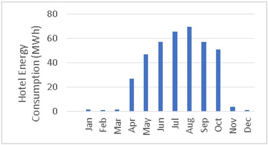 KBH is a popular tourist hotel situated in the village of Kolymbia on the northeastern coast of the Greek island Rhodes (36°14′45.63″ N 28°09′40.3″ E). It is a family-run business with 58 guestrooms in three buildings and also features a swimming pool, a bar, a restaurant, and a supermarket. The hotel currently sources all its electrical energy from the local utility provider, which primarily relies on fossil fuel-based sources. The hotel’s hot water requirements are covered by 42 two-square-metre solar thermal panels, supplemented by electrical heat pumps during the winter. The location of the hotel offers a high solar capacity with a long-term average photovoltaic power potential of approximately 1700 kWh/kWp per year [24]. Unlike the south and west of the island, the potential for wind power at this location is insignificant [25]. PV technology is therefore prioritised in this particular case study. High external temperatures experienced during the summer months in Kolymbia village significantly increase the demand for air conditioning at the hotel. This, coupled with increased visitor numbers, results in a large peak in energy consumption between April and October (Figure 2). Positively, it can be seen that the hotel’s energy demand peaks when the solar potential is at its highest (Figure 2 and Figure 3). This points to solar energy as an appropriate choice. In 2021, with a price of 0.23 EUR/kWh and an assumed energy demand for a regular year of 385 MWh, the total annual cost (TAC) for electricity was about EUR 88,550 for the KBH. The price of electricity recently increased to 0.30 EUR/kWh (exact value obtained for March 2022). This value was taken as the upper bound of electricity price in our parametric study shown in Section 4.1.