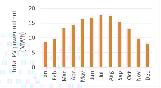 Monthly average of total PV power output for the location (36°14′45.6″ N 28°09′40.3″ E) based on a medium-sized commercial PV system with installed capacity of 100 kWp, which delivered about 161 MWh in 2019 [24].