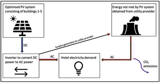 In addition to buildings 1–5, the energy metre was added to the model as a single location to account for the fact that the hotel’s energy demand applies to the hotel as a whole, not just individual buildings. It was assumed that all the energy generated by PV technologies on each building was converted from DC to AC, applying separate inverters for each building and then transferred to the energy metre. As a result, any interactions between PV generation, energy demand, the utility provider, and carbon emissions were taken into account.