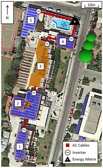To account for the different investment costs for the construction of transmission cables linking the PV technologies on each building to the energy metre, the modelled hotel was divided into six locations: buildings 1–5 and the energy metre (Figure 5). The further away the respective building is from the energy metre, the higher the investment costs for the PV systems of the given building will be (due to the correspondingly higher wiring requirements). It was important to ensure that the cost of supplying AC cables from each building to the energy metre was only factored in once. The surface area available for PV installations on each building and the distance from the energy metre are outlined in Table 2 and illustrated in Figure 5. In order to define an economically viable positioning of the PV panels, the spacing of the PV panels was chosen as a compromise between maximum installed capacity and shading losses, as shown in Figure 6. These results were generated using the software Helioscope [39] and take the geometric constraints caused by the real geometry of the roofs and the panes into account. The shading losses are summarised in Table 3. These losses reduce the total PV capacity installed to an effective capacity that is used for the simulations.