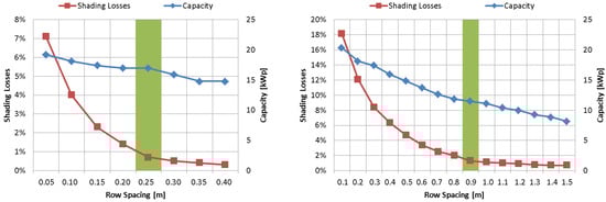 Shading losses and capacity as a function of row spacing shown for the example of building 1 with the tilt angles of 8° (left) and 25° (right). Please mind that the x-axes are scaled differently.