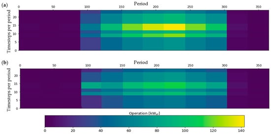 Colour map illustrating the electricity demand profile of the KBH across a given year (period) and during a given day (timesteps per period): (a) current electricity demand and (b) proposed reduced electricity demand.