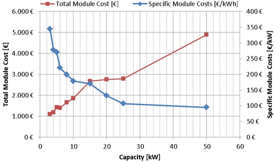 - We assume that one inverter is installed in each building. The inverters from SMA’s Sunny Tripower series [55] have been given as options for the FINE model so that an inverter with the appropriate power can be installed. The costs per power, as well as the specific costs per capacity, are shown in Figure 9;