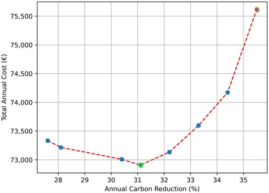 - Several runs were conducted for each model variation to record a Pareto front. Minimum TAC was identified by running the model with no constraints. The lowest possible carbon constraint can be found by changing the model’s objective function to the net carbon emissions. To calculate the carbon reduction, the carbon emissions without any PV modules installed could be evaluated by multiplying the sum of the electricity demand over the year with the amount of carbon produced when consuming 1 kWh of electricity acquired from the utility provider;