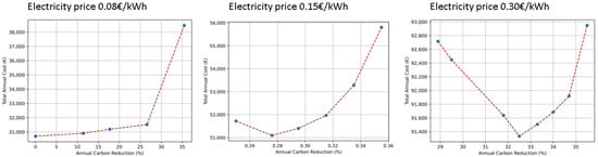 - Any electricity acquired from the utility provider was assumed to produce 0.42 kg CO2/kWh [57]. Different prices for electricity were assumed: 0.08 EUR/kWh, 0.15 EUR/kWh, 0.23 EUR/kWh (which is the actual realistic price for electricity in Rhodes in 2021) and 0.30 EUR/kWh (which is the actual price for electricity in Rhodes in March 2022), respectively;