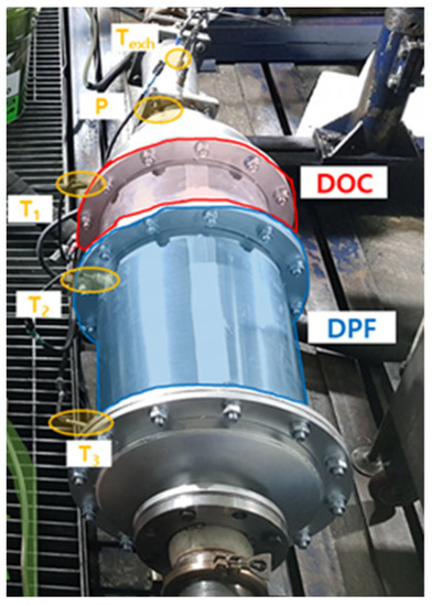 Figure 2 shows the target system which is composed of a diesel oxidation catalyst (DOC) that increases the temperature for oxidation of unburned gas, and regeneration of the DPF and is designed to be used in engines with a maximum output of 300 hp. The DPF was supported by a cordierite-type catalyst with a cell density of 100 CPSI. Detailed specifications are listed in Table 1.