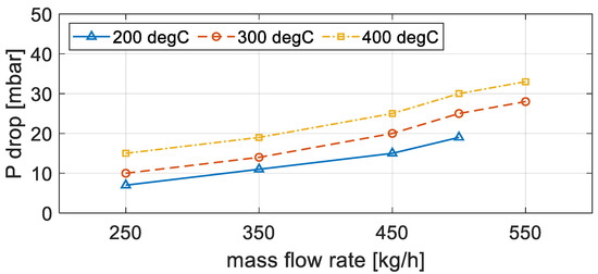 Figure 3 shows the results of the differential pressure of the zero-PM condition according to the temperature and flow rate change. The values of the differential pressure are distributed in the range of 7–33 mbar, as shown in the Figure 3 and Table 2. The differential pressure has a positive correlation with both the exhaust gas flow rate and exhaust gas temperature, and the increase in the flow rate when the temperature decreases has a great effect on the differential pressure. Under the same flow rate condition, the pressure change increases as the temperature increases because the DPF carrier cordierite expands as the temperature increases and the filter porosity decreases. High-speed and low-load operation of the engine is required to obtain a filter temperature of 200 °C and an exhaust gas flow rate of 550 kg/h. However, differential pressure data cannot be obtained under these conditions because the target engine has a minimum temperature of over 200 °C at an exhaust flow rate of 550 kg/h.