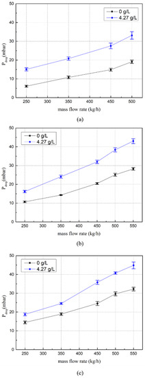 The analysis was performed under a soot loading of 0 g/L, as shown in Figure 3. Flow rate and temperature were set to be 3 °C/min. When the exhaust gas temperature in front of the DPF reaches 200 °C, the differential pressure is measured while increasing the flow rate from 250 to 550 kg/h. The x-axis in Figure 7 represents the test number, where 14 test conditions were used.