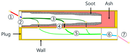 The differential pressure of the DPF under clean conditions is shown in Figure 6. No. 1 and No. 7 in Figure 6 denote the exhaust gas flowing into the DPF inlet and exiting the outlet, respectively, resulting in a loss of inertia due to contraction/expansion at the DPF plug and inlet/outlet channels, as indicated by the numbers. It can be divided into pressure loss owing to frictional resistance, and that occurs while passing through the filter, as in No. 4.
