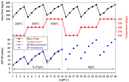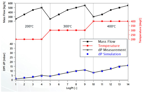 The results presented in Figure 7 show that the simulation data are in good agreement with the measured data (dP of the DPF). The maximum error value obtained between the simulation and experimental data was less than 1 × 10−3 bar; therefore, the model is effective and can make accurate predictions.