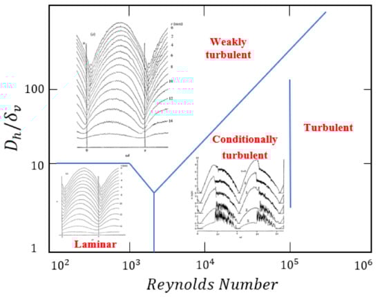 - Hino, M.; Sawamoto, M.; Takasu, S. Experiments on Transition to Turbulence in an Oscillatory Pipe Flow. J. Fluid Mech. 1976, 75, 193–207. [Google Scholar] [CrossRef]