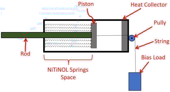 This research effort is aimed at presenting a design of a solar-driven SMA thermomechanical actuator. The basic conceptual design of the linear actuator is illustrated in Figure 1, where the main parts of the thermomechanical SMA actuator are shown. The presented novel design utilizes the SME that exists in NiTiNOL springs to give an actuation mechanism via absorbing and releasing the natural solar thermal energy by using an SHC. The SHC works when it is exposed to sun solar radiation from sunrise until sunset, where the solar radiation is absorbed by the SHC, producing a greenhouse effect inside its body. Therefore, the SHC acts as the activation key in this design, where the NiTINOL springs gain thermal energy via the SHC, where they are activated, while when they lose this thermal energy via the SHC, they are deactivated. Additionally, the actuator is meant to be a piston-based actuator with a bias load that can reorient the NiTiNOL springs to their original shape when they are deactivated.