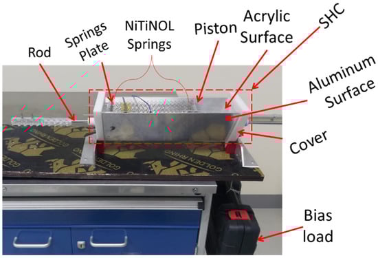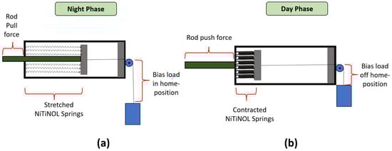 The solar-driven thermomechanical SMA actuator operates passively using thermal solar energy. In addition, the actuator’s actuation mechanism includes two phases: day and night, as shown in Figure 2. During the daytime, the NiTiNOL springs gain the solar thermal energy by the SHC and are activated, which contracts the NiTiNOL springs, lifting the bias load, and the rod produces a push force. Conversely, when the NiTiNOL springs lose the solar thermal energy to the ambient and are deactivated at night, the NiTiNOL springs re-elongate, the bias load falls, and the rod produces a pull force.