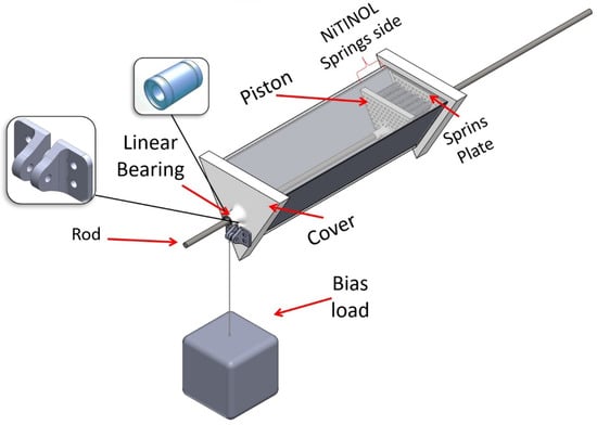 The solar-driven thermomechanical SMA actuator design has been carried out using computer-aided design (CAD) software, as shown in Figure 3. The designed actuator functions as a piston-based actuator, where the piston is in between the bias load and SMA (NiTiNOL) springs. The actuator transmits the forces through a rod that passes through the linear bearings located inside the cover of the actuator’s SHC. Additionally, the SHC is considered a central part of the actuator that provides the necessary solar energy to the NiTiNOL springs. As the heat collectors change in size and shape, all components inside the heat collector change accordingly.