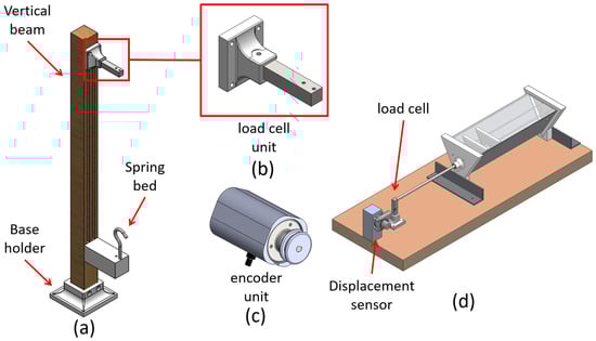 The NiTiNOL springs assessment platform’s mechanical setup is designed to have dual use. The platform consists of fixed parts and removable extensions. The fixed parts of the platform are a base holder, a beam with two vertical passways, and a spring bed, as shown in Figure 5a. As for the removable extensions of the platform, there are two parts: the encoder unit and load cell unit, as shown in Figure 5b,c. The removable extensions enable the platform to act for both force and displacement assessments. In addition, having removable attachments help to facilitate the adjustments in the distance between the spring bed and the attachment. The load cell unit is installed in the beam for the force assessment test, and the NiTiNOL spring is connected between the spring bed and the load cell unit. As for the displacement assessment test, the encoder unit is installed in the beam, and the NiTiNOL spring is connected between the spring bed and the encoder unit.